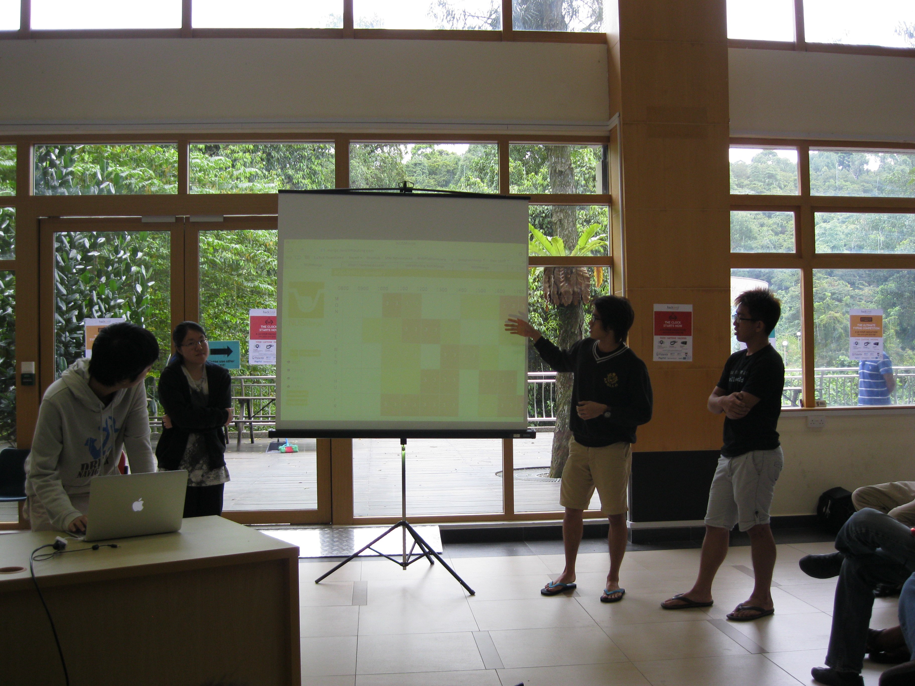 There were also several spot prizes given out to teams the judges felt particularly deserved them. The Best Freshmen Effort prize went to Team Nange, who built a web app (https://github.com/yyjhao/NUSMorge) that hooked into NUSMods to show overlaps and free spots between different timetables. Each member was given an Arduino Leonardo.